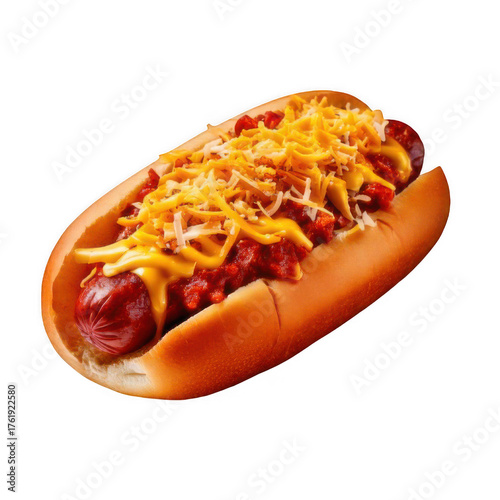 hot dog with chili and shredded cheese isolated on white and transparent background.
