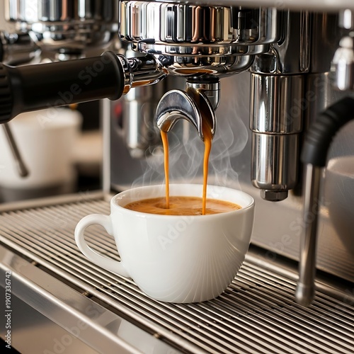 Hot, freshly brewed espresso streams into a white ceramic cup from a professional machine