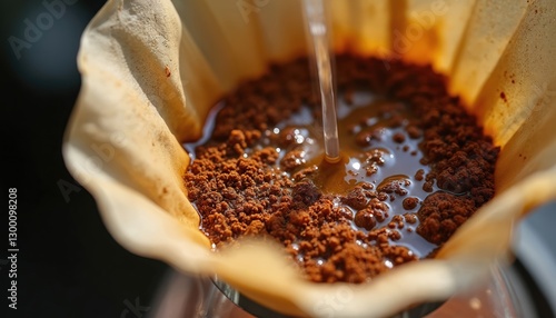 Hot water pouring over freshly ground coffee in paper filter during manual brewing process. Creating bloom as coffee grounds absorb water, releasing rich aroma. Drip coffee preparation.