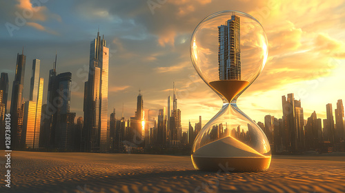 Hourglass with Pixelated City Inside Under Dramatic Sunset on Desert Landscape