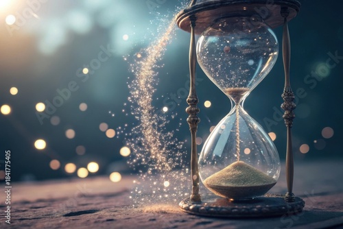 Hourglass with sand falling and sparkling bokeh lights in background