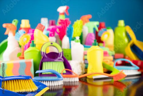 House and office cleaning theme. Colorful cleaning kit on blue background.