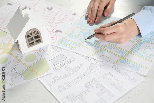 House hunting. Woman with maps and house figure at white table, closeup