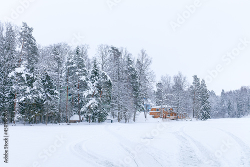 Houses by the frozen lake. Snowy winter day.