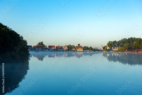 Houses on a foggy lake "Nieuwe Meer" in Amsterdam.