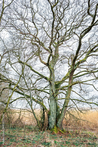 Huge branchy tree with several trunks and crooked branches at the edge of the forest with young shoots