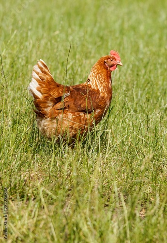 Hühnerhaltung - Huhn auf einer grünen Wiese