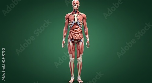 Human Anatomy Illustration Showing Muscles, Skeleton, and Internal Organs