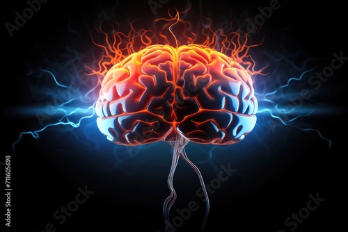 Human Axon Brain dynamic energy lightning and thunderbolt flashes. Brain energy consumption, cerebral blood flow, and oxygenation. Metabolism brain fuel. Metabolic processes ketones and glycolysis.