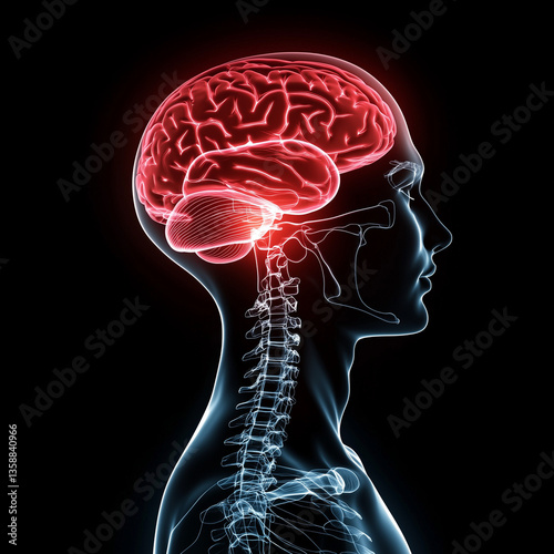 Human Brain Anatomy Red Highlighted Cerebrum Spinal Cord and Skull X Ray View