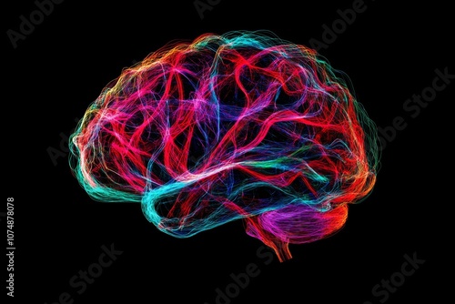 human brain in neon colors with dark background, neural connections and data concept