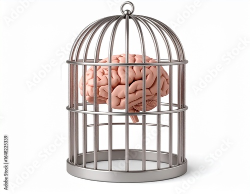 Human brain locked inside cage, representing trapped thoughts, stress, and anxiety. Generated image