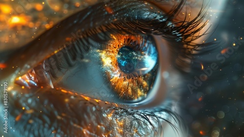 Human eye creative composition. closeup of woman face macro photography. with sparkles like fireflies around the pupil.