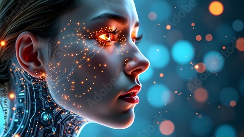 Human Face with Glowing Circuits and Neon Wires in Tech-Infused Space