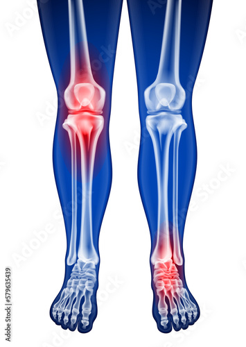 Human femur, knee and foot x-rays showing pain points in red for medical and educational use on a blue background.