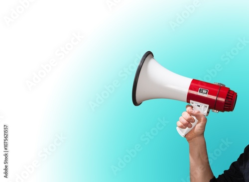 Human hand holding megaphone speaker on background