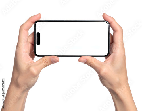 Human hands holding a modern smartphone with a blank white screen on black background