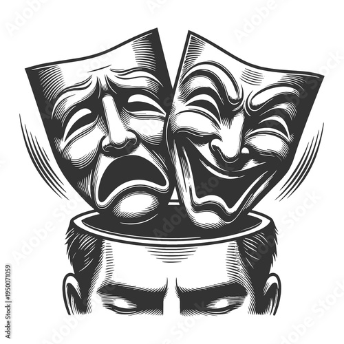 human head opened to reveal comedy and tragedy masks inside, dual emotions, inner conflict, and psychological complexity sketch engraving raster illustration. Black and white image.