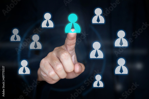 Human resource management and HR recruitment concept; Businessman selecting one person from crowd