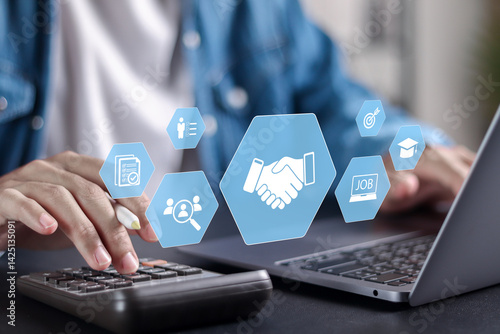 Human resources and talent management concept. recruitment, employment, job offer, candidate, applicant interview by recruiter, career advice. HR manager use laptop with HR management icons.