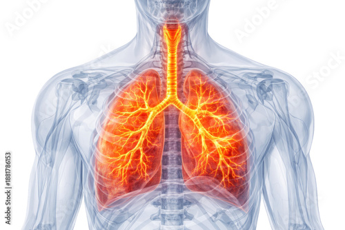 Human respiratory system anatomy showing lungs trachea and bronchial network with internal organs highlighted isolated on white background
