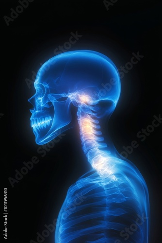 Human skeleton structure in blue light on a black background.