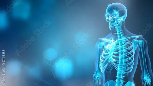 Human Skeleton X-Ray Scan on Blue Background for Medical and Healthcare Concepts.