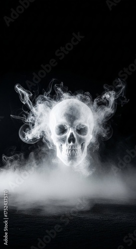 Human skull emerging from white smoke on black background. Eerie mist effect for dark fantasy and Halloween concepts. Abstract artistic vapor.