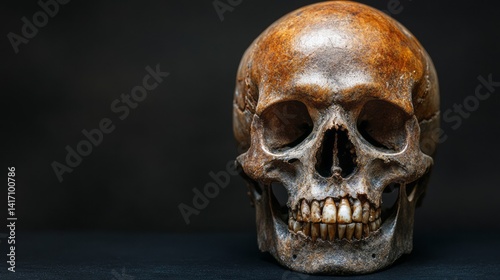 Human skull shows details against dark background in close up