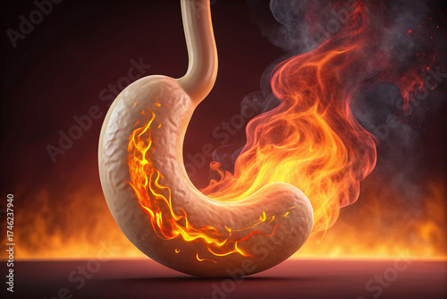 Human stomach burning inside body showing acid reflux and gastric issues with fire concept