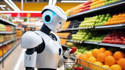 Humanoid cute robot working in supermarket, nanotechnoogy, progress in 21st century
