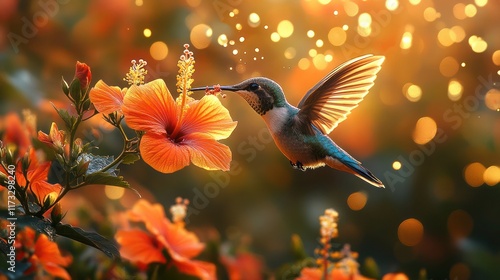 Hummingbird feeding on a vibrant orange hibiscus flower in a sunlit garden.