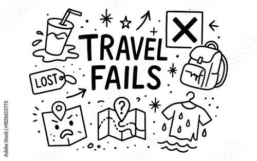 Humorous travel misadventures doodle with icons featuring errors and mishaps