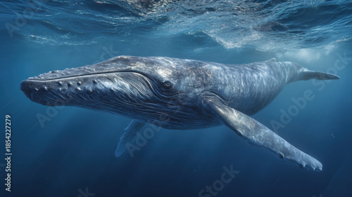 Humpback whale gliding underwater in deep blue ocean with sun rays filtering through water, powerful marine wildlife scene highlighting ocean life, nature conservation, and majestic aquatic beauty