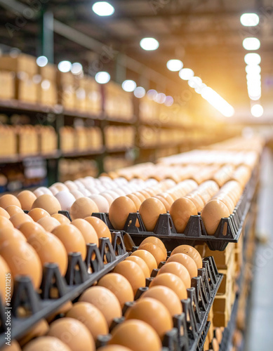 Hundreds of brown eggs are neatly arranged in black trays on metal racks inside a large, brightly lit warehouse, ready for packaging and distribution nationwide.