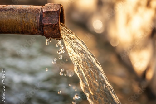 hydraulic. Clear water flowing freely from an unclogged metal pipe with studio lighting. safety posters, maintenance manuals, designed for industrial assembly lines and welding operations.