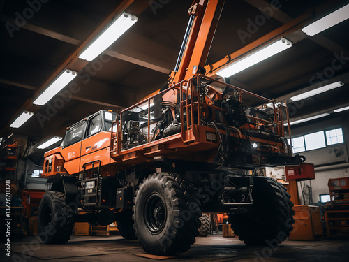Hydraulic lifts rise exposing the undercarriage as maintenance work proceeds under bright lights