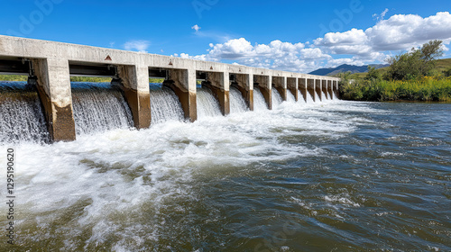 Hydroelectric dam generating clean energy with flowing water and blue sky