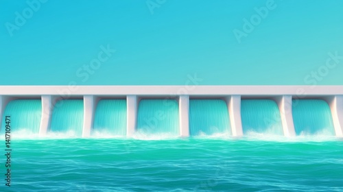 Hydroelectric Dam Turquoise Water and Bright Blue Sky