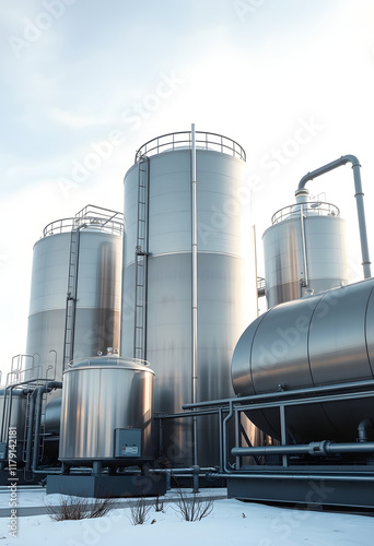 Hydrogen power plant, large steel tanks and pipes, wide angle photo, some snow in foreground. Clean H2 energy concept as imagined by, detailed, with white tones