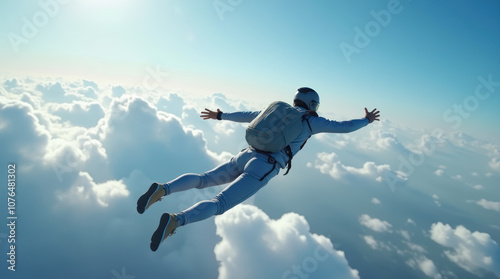 Hyper-realistic skydiving experience over fluffy clouds and bright blue sky