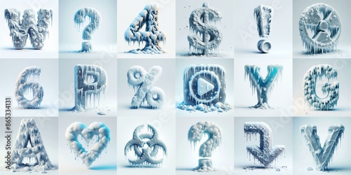 art, generative, generated, illustration, ai, typeset, typography, letter, lettering, typeface, typographic, letter, type, alphabet, font, text, character, rudiments, icy, snowy, melting, iceberg, snowfall, christmas, snowflake, typescript, seasonal, collection, creative, snow, ice, winter, cold, style, signs, frost, blue, symbol, graphic, cool, design, set, three-dimensional, glacé, season, white, poster