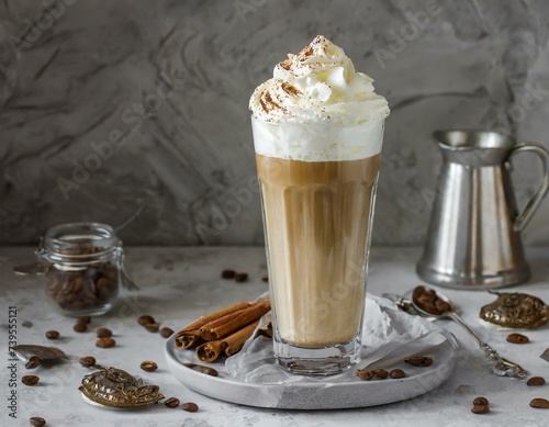 Ice cafe latte with whipped cream on top in high glass