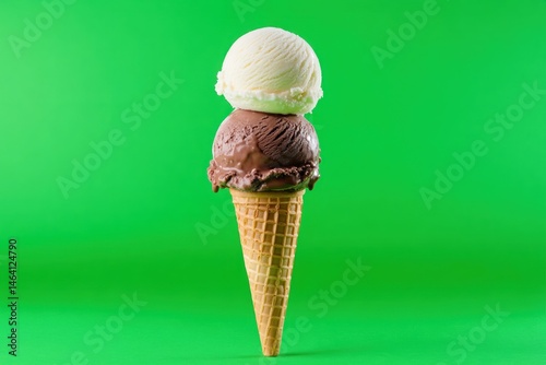 Ice cream cone with vanilla and chocolate scoops on green background
