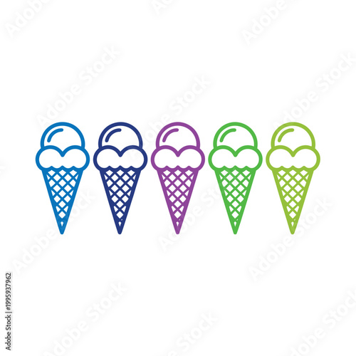 Ice cream cones lined up in a row on a plain background