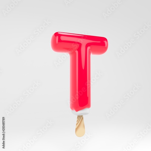 Ice cream letter T uppercase. Pink popsicle alphabet. 3d rendered dessert lettering isolated on white background.
