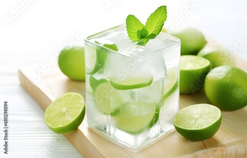 ice cubes, mint herb and fresh lime slices in glass on white wooden table