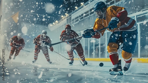 Ice hockey players actively engaged in a night game on an ice rink with snow falling, highlighting the energy and intensity of the sport amidst a wintery setting.
