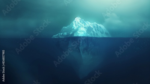 Iceberg floating on dark sea, large part visible underwater, smaller tip above surface