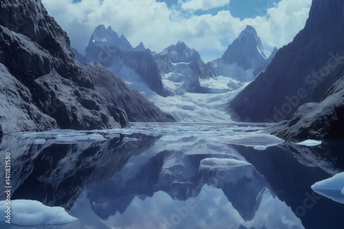 Icebergs drifting on a glacial lake, showcasing reflections of majestic snowy mountain peaks beneath a dramatic, cloudy sky